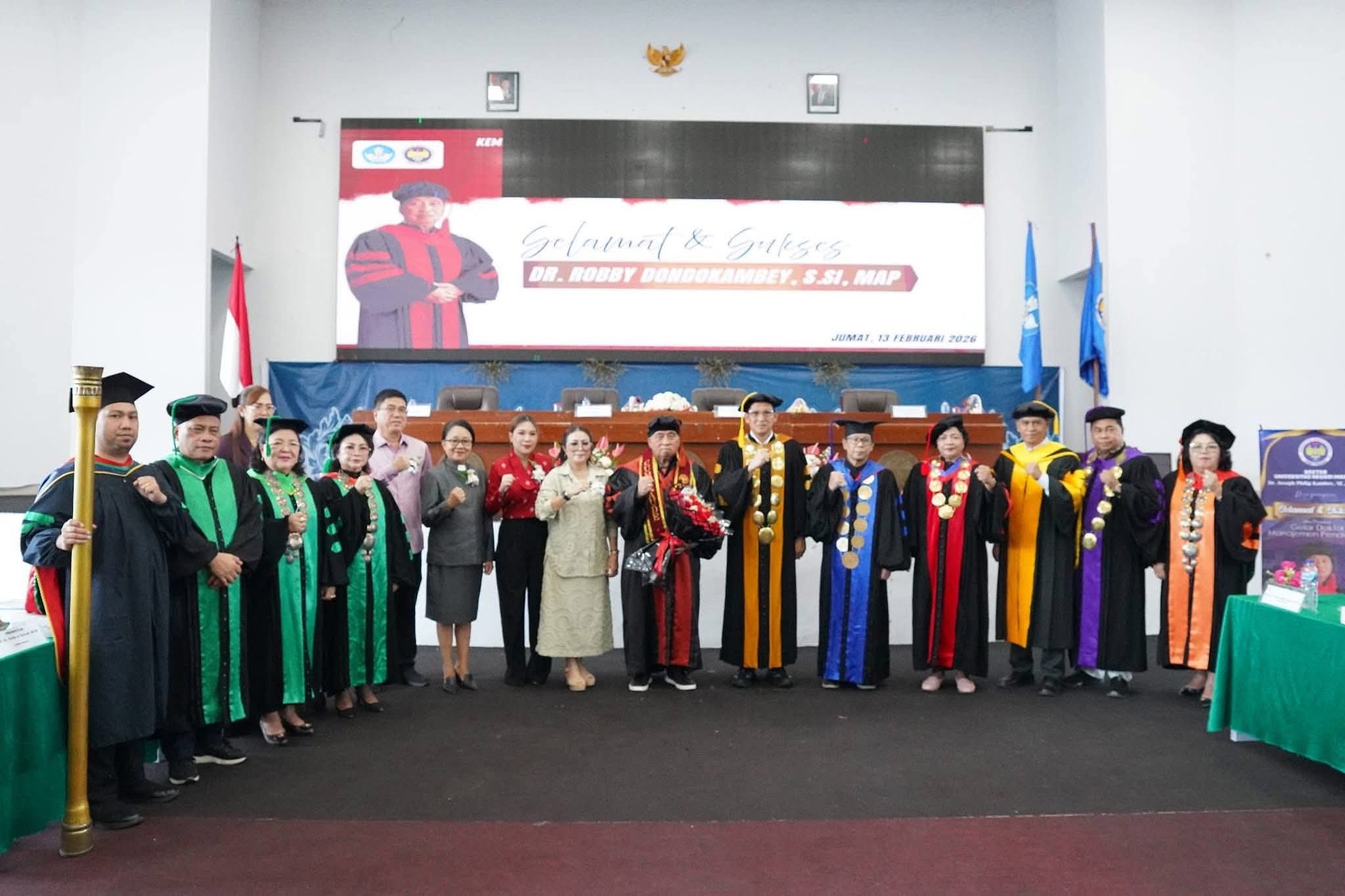 MINAHASA – Kepemimpinan berbasis ilmu pengetahuan kembali ditegaskan Bupati Minahasa Dr. Robby Dondokambey, S.Si, MAP setelah resmi menyandang gelar Doktor usai lulus Ujian Promosi Doktor Program Studi Manajemen Pendidikan (S3) dengan predikat Cum Laude, yang digelar di Gedung Training Center Universitas Negeri Manado (UNIMA) Tondano, Jumat (13/2/2026).