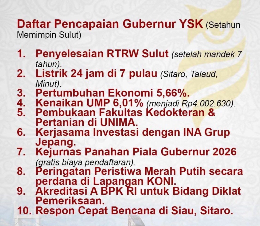 Dari penataan ruang hingga diplomasi global, dari elektrifikasi kepulauan hingga reformasi SDM, Gubernur YSK memosisikan Sulawesi Utara pada jalur transformasi yang stabil, terukur, dan berdaya saing—menuju provinsi yang kompetitif, inklusif, dan siap memainkan peran strategis di tingkat nasional maupun internasional.